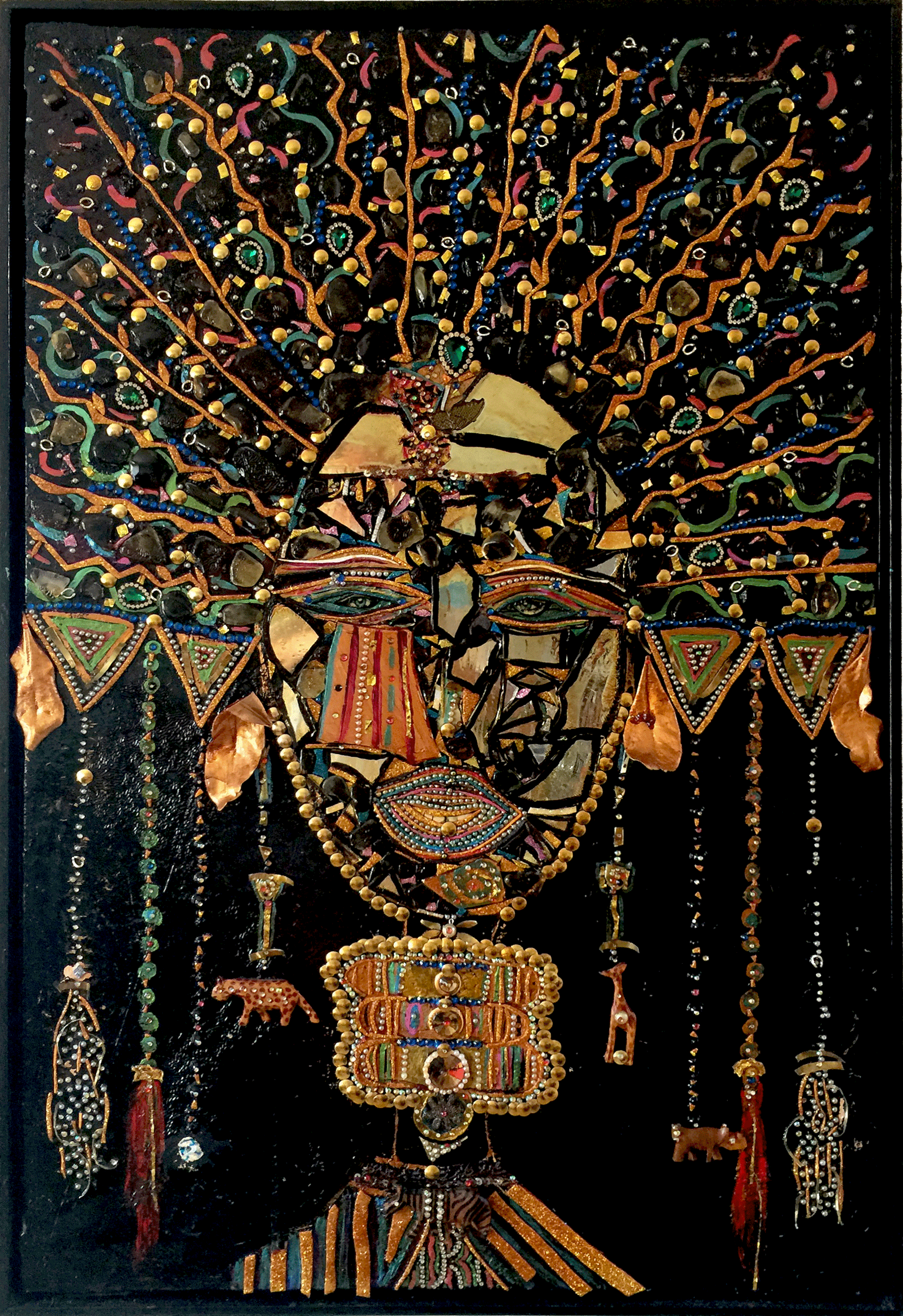 Mirrors, rhinestones, carved wood animals, silk, mixed media