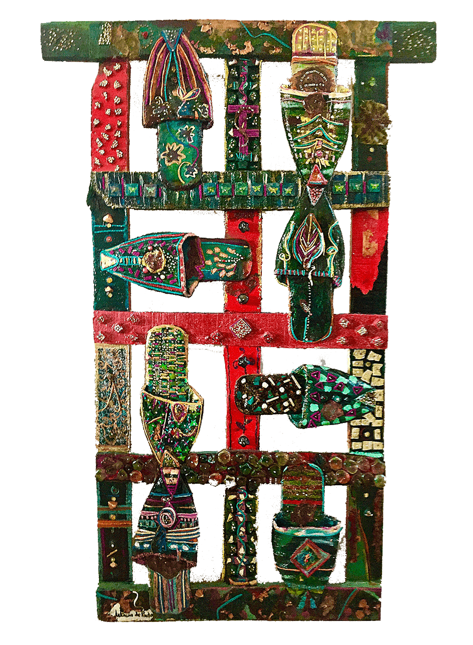 Baboojes frozen in time, rhinestones, beads, tiles painted in acrylic on wood pallet