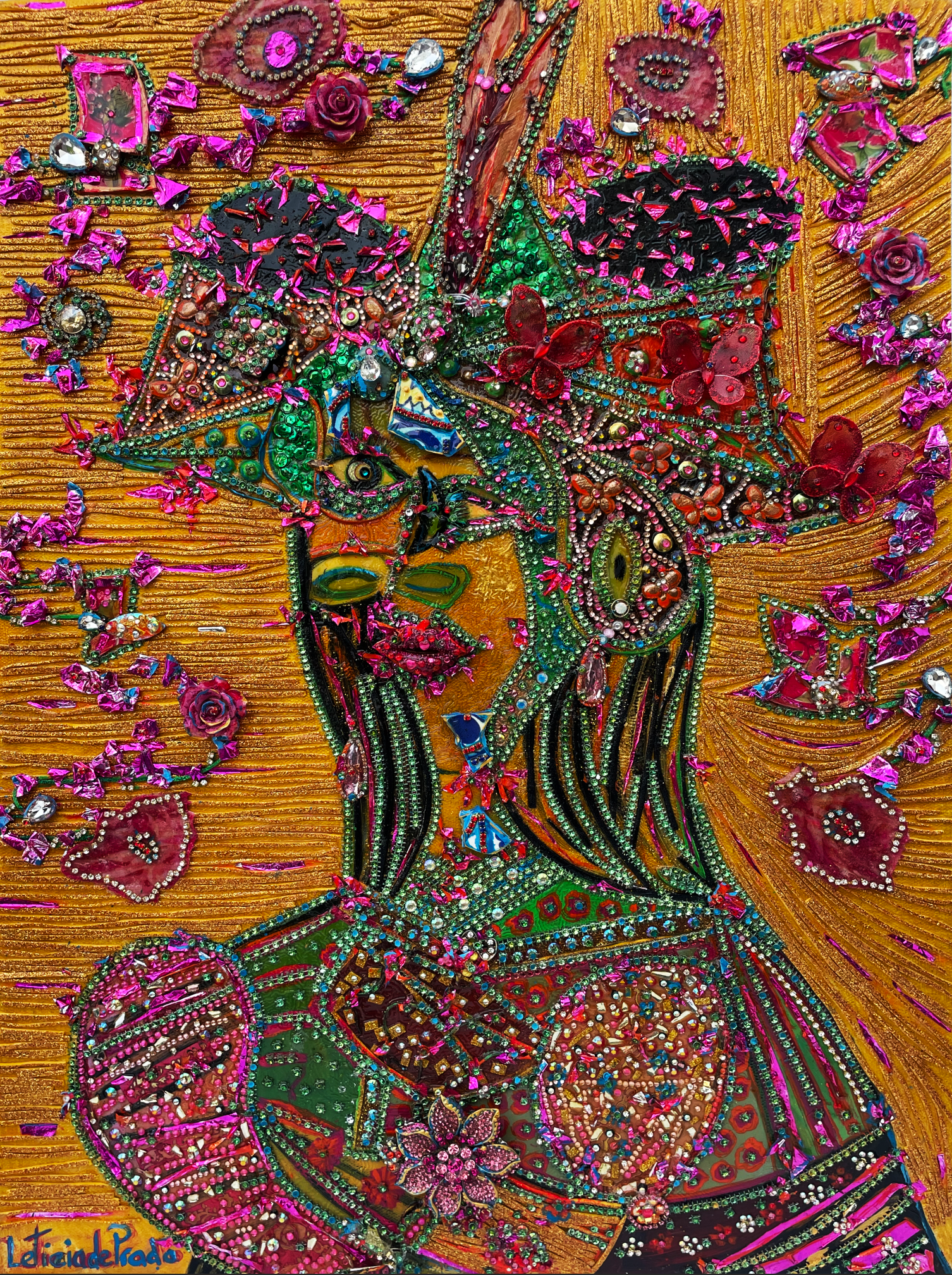 Oil on canvas infused with rhinestones, mirrors, beads, silk mixed media