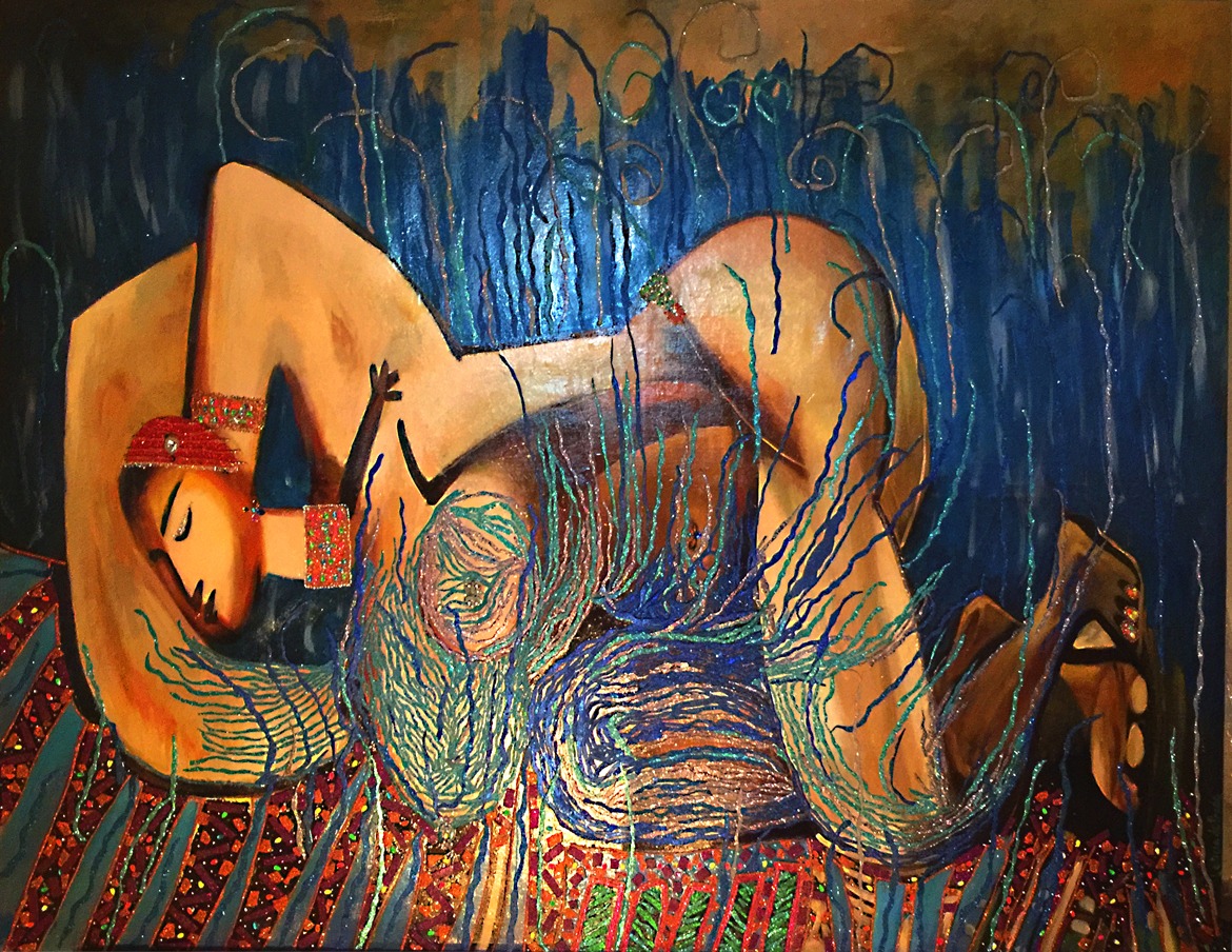 Oil on canvas infused with rhinestones, mirrors, silk