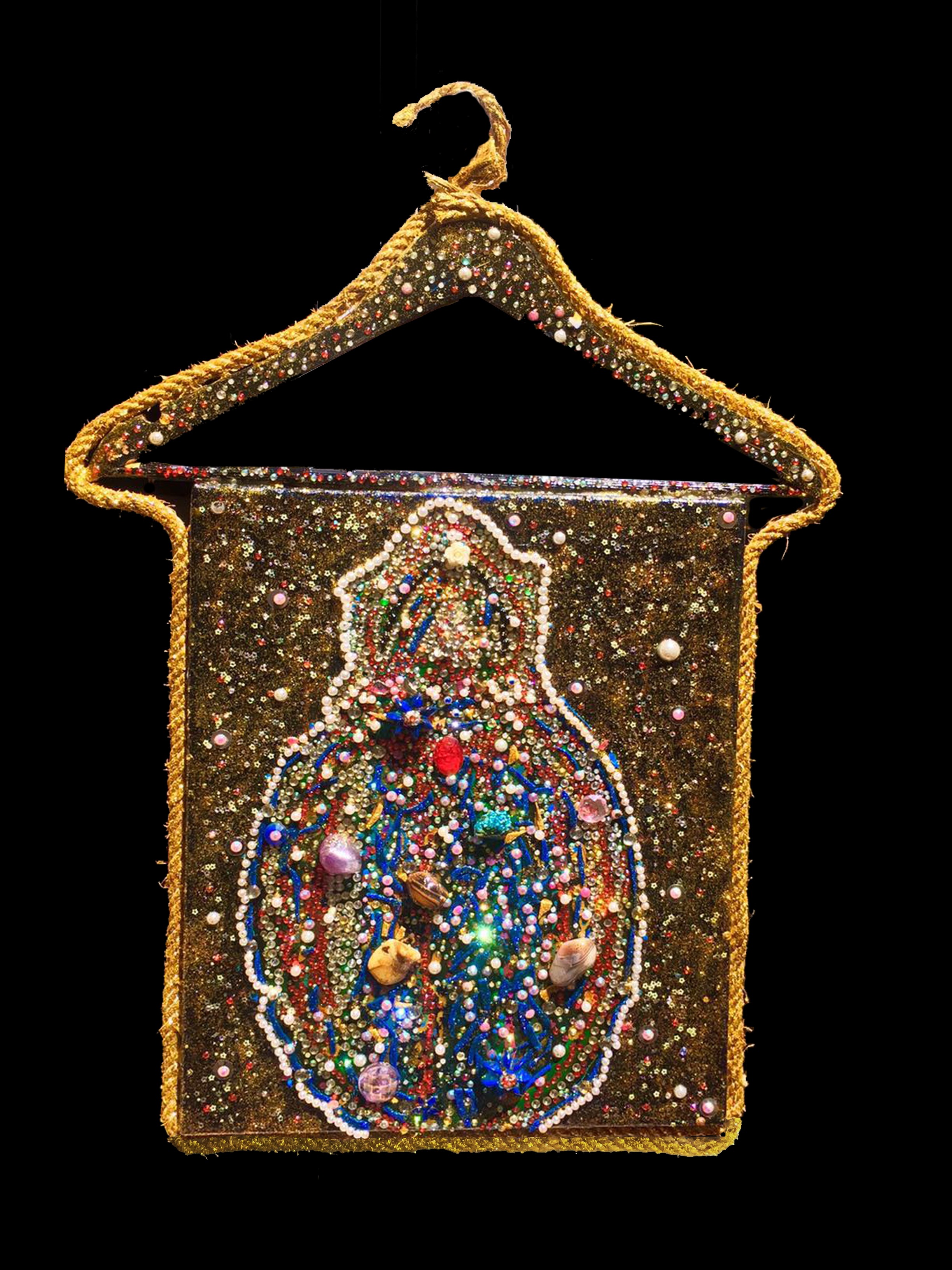 Rhinestones, beads, pearls on canvas with a hanger