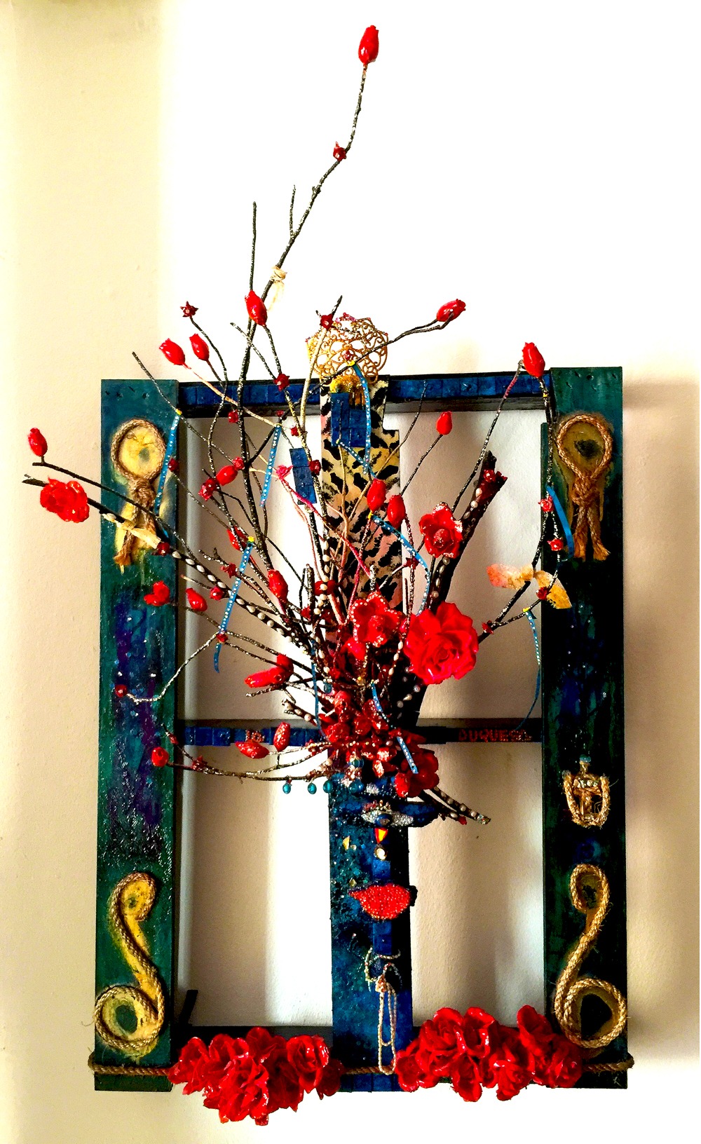 Silk Flowers, natural branches, natural Manila rope, ceramic tiles on wood pallet