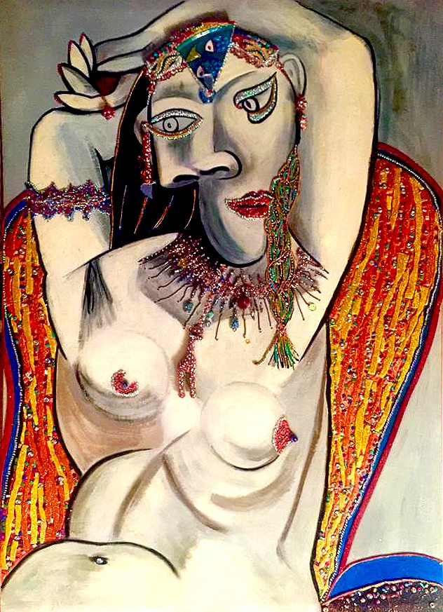 oil on canvas infused with rhinestones, mirrors, silk and mixed media