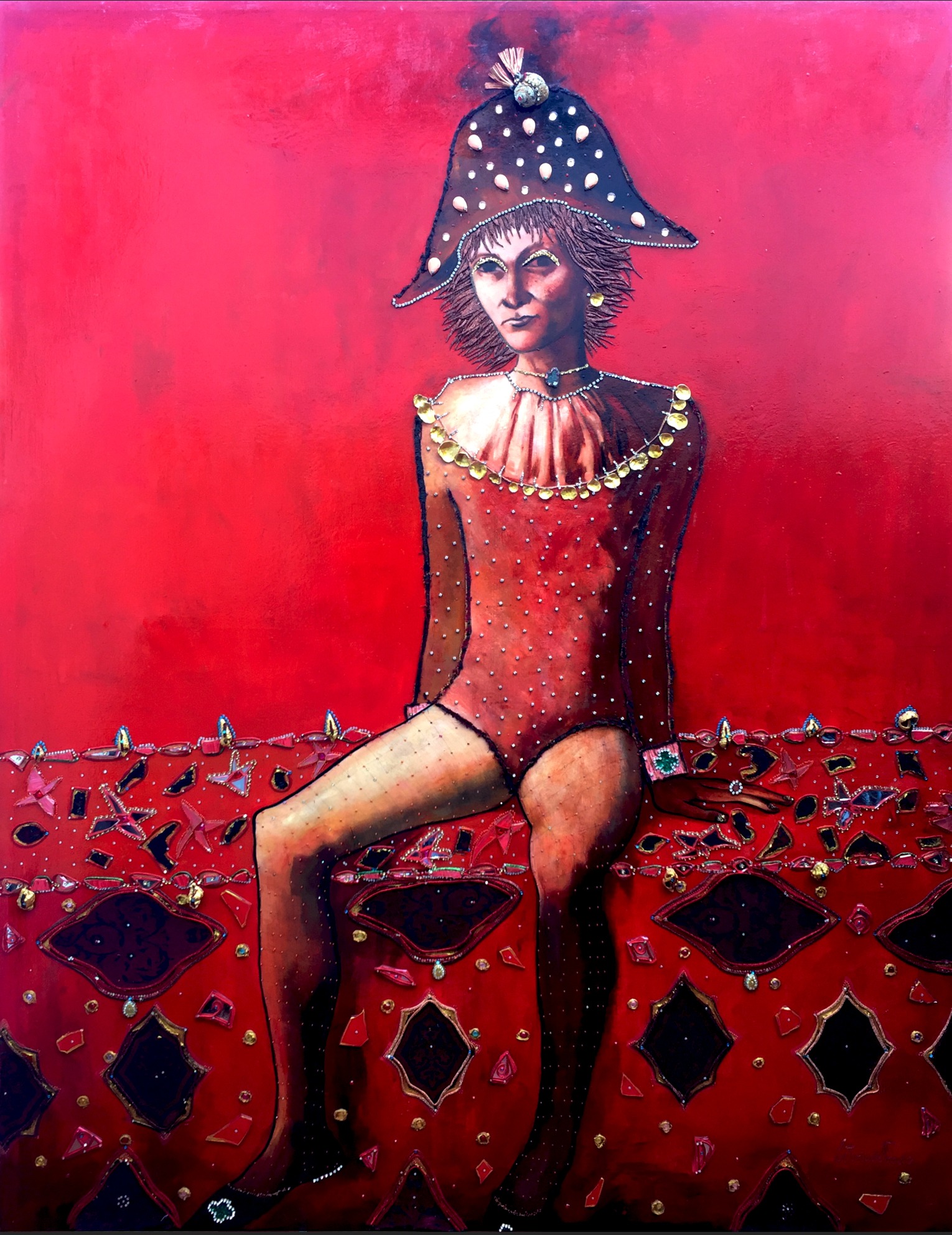 Oil on canvas infused with rhinestones, mirrors, silk and other mixed media