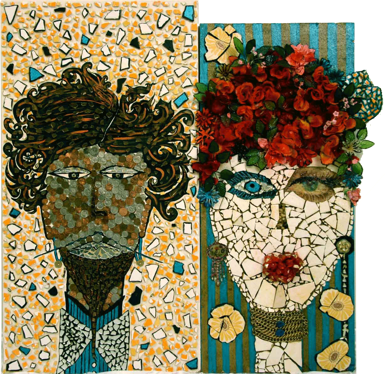 Cyramics mosaic, silk flowers mixed media on wood panels