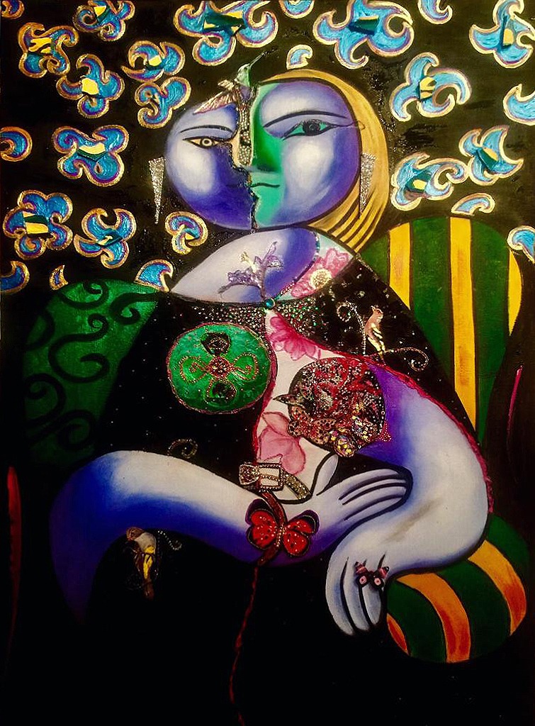 Rhinestones, silk and mixed media on oil on canvas
