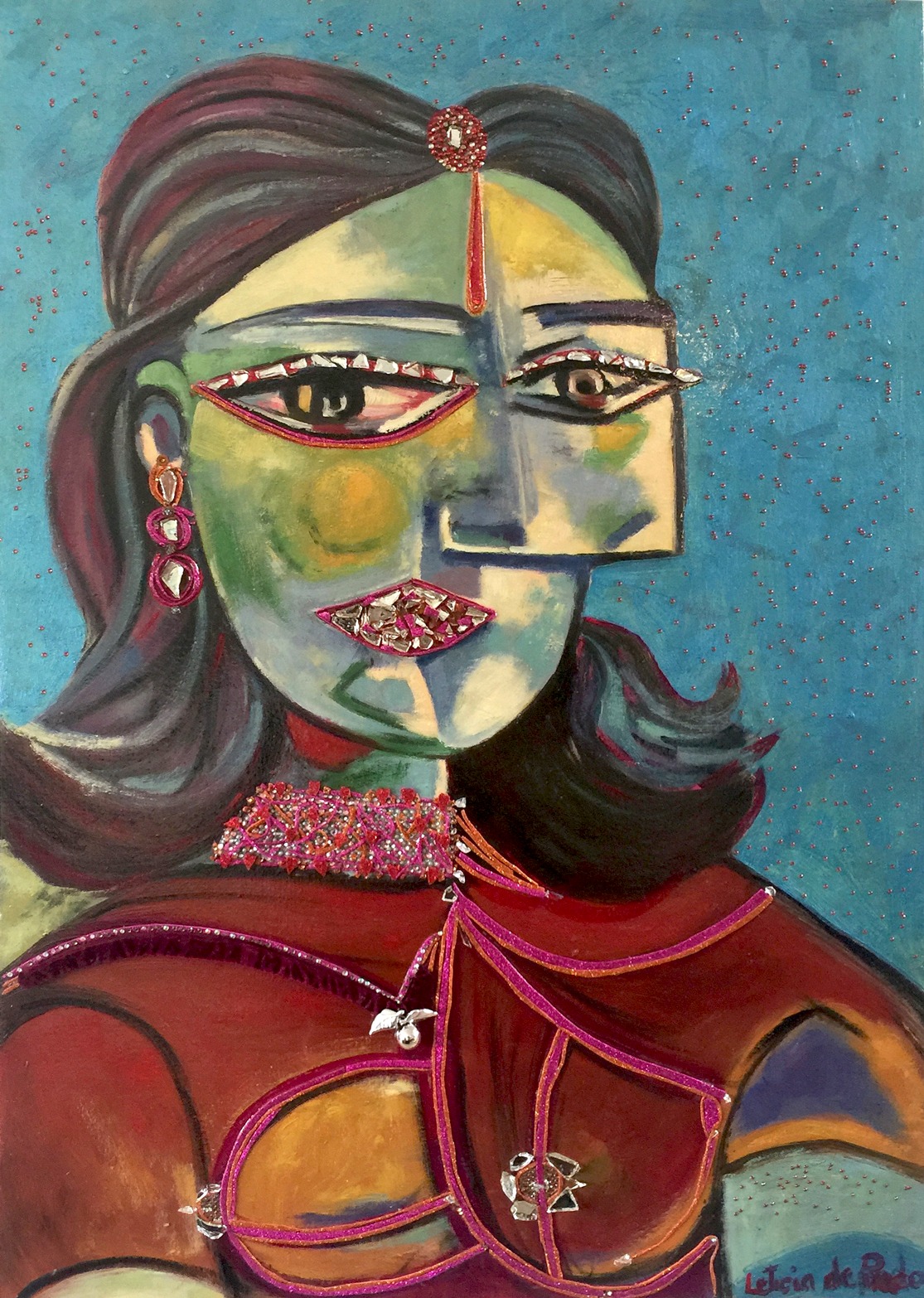 oil on canvas infused with rhinestones, mirrors, silk and mixed media