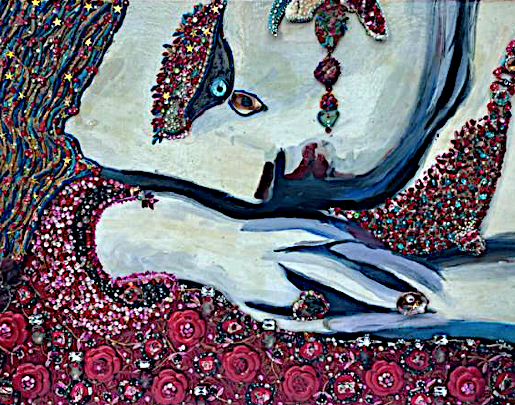 Oil on canvas infused with rhinestones, mirrors, silk and other mixed media